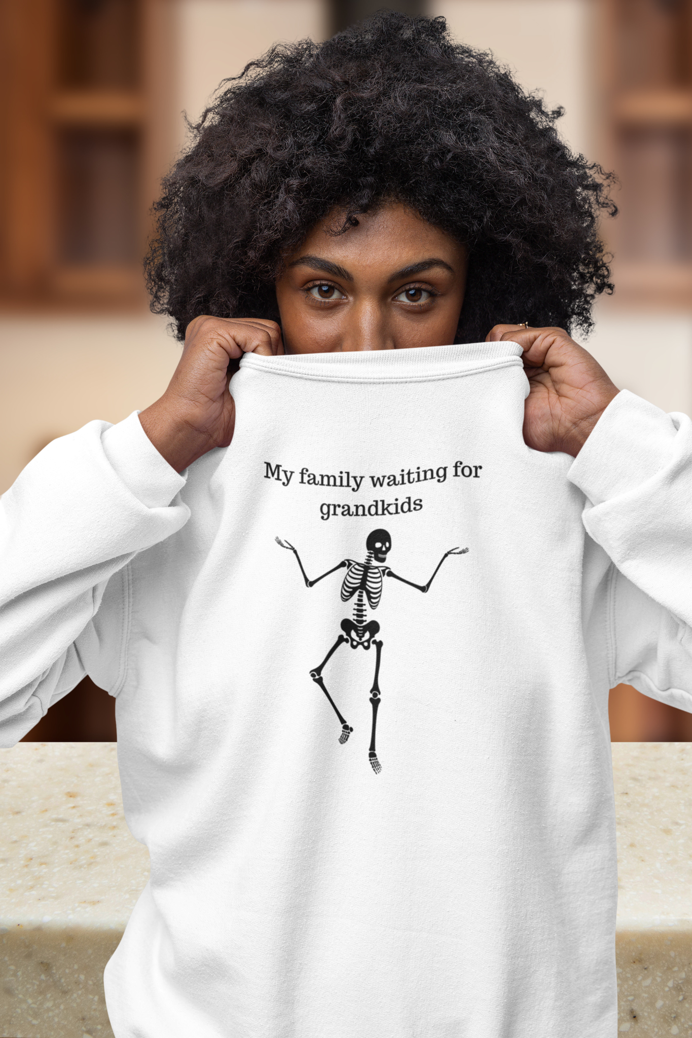 This sweatshirt is the perfect blend of humour and relatable family pressure. Featuring an "I don't know" shrugging skeleton, this sweatshirt will keep your pesky family members off your case about grandkids. Wear this at your next family gathering to keep things light and funny when relatives start asking you that question.