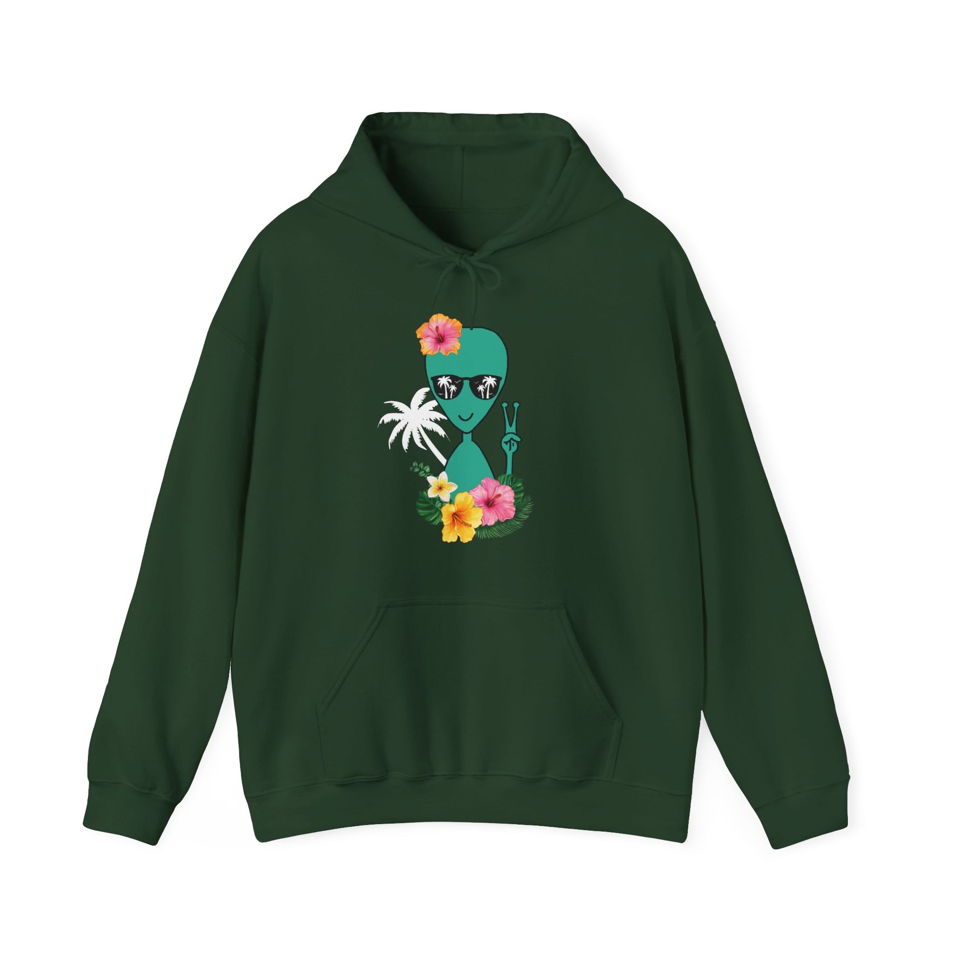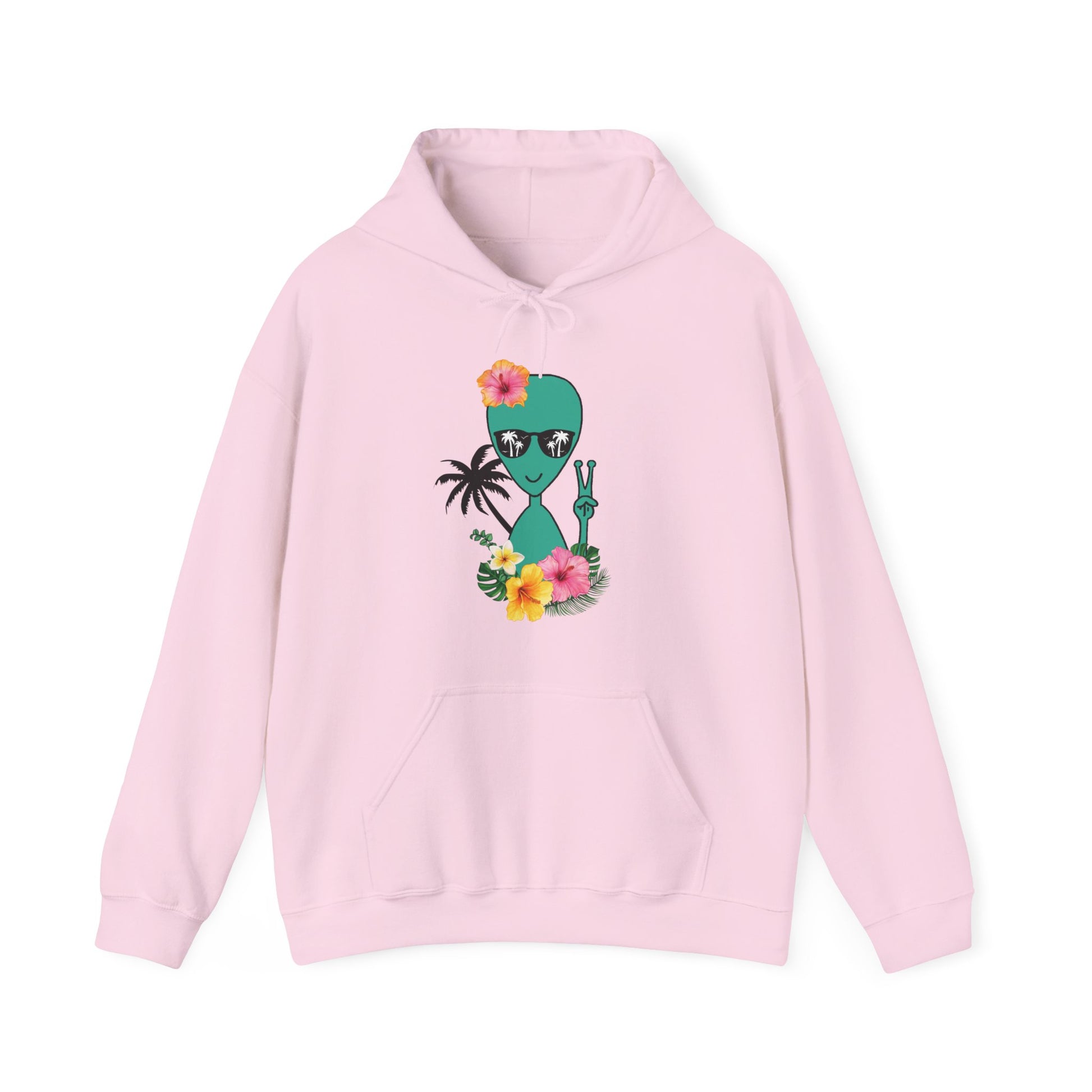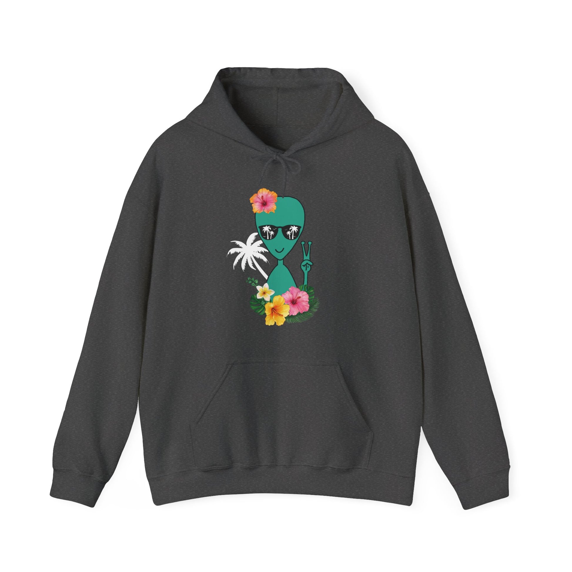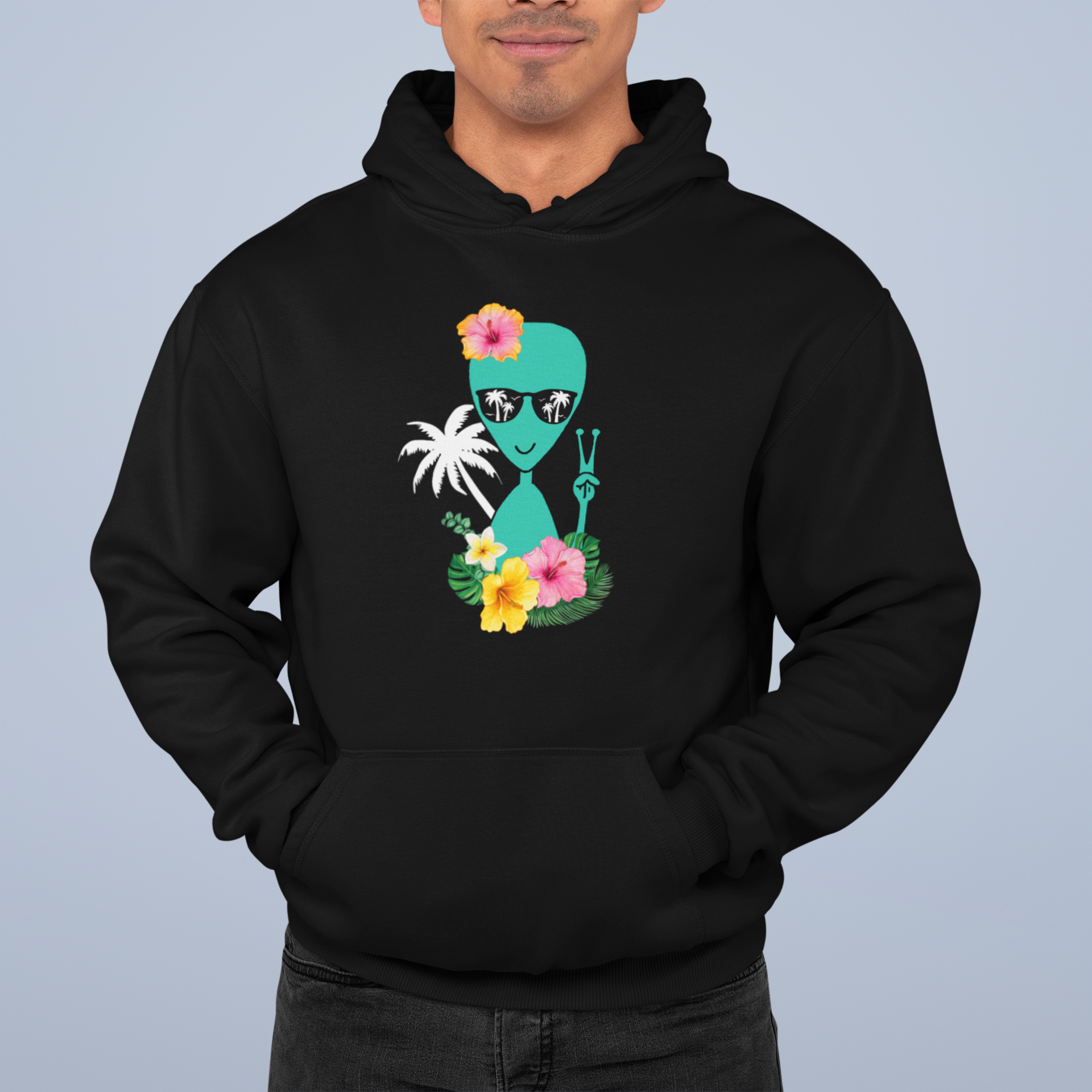 Take your style to the stars, or the beach with this tropical alien hoodie 👽 For those who love all things extraterrestrial, palm trees and sun, this hoodie features a happy alien that is living his best life in paradise! The perfect gift for UFO lovers, sci-fi fans, and space enthusiasts, who also like love bragging about their last beach vacation. This friendly, peaceful alien will bring his positive vibes with you wherever you go!